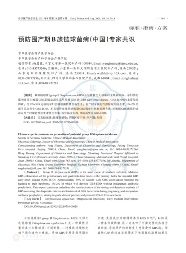 为规范预防GBS感染可能导致的母婴健康风险,2021年中华围产医学杂志发布的《预防围产期B族链球菌病(中国)专家共识》明确提出,需要对所有孕35~37周的孕妇进行GBS筛查,GBS阳性患者需要在进入产程后针对GBS预防性使用抗生素。