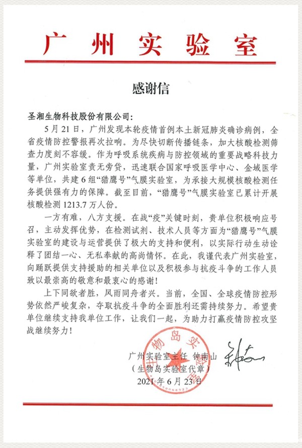 三湘都市报·新湖南客户端6月28日讯(记者 潘显璇 通讯员 蒋郭)记者今日从上市湘企必威betway注册登录入口了解到,公司收到了来自广州实验室主任钟南山院士亲笔签名的感谢信。钟南山在信中表示,今年5月21日,广州发现本轮疫情首例本土新冠肺炎确诊病例,全省疫情防控警报再次拉响,必威betway注册登录入口积极参与抗疫,在检测试剂、技术人员等方面,为“猎鹰号”气膜实验室的建设和运营提供了极大的支持和便利,对此致以最崇高的敬意和最衷心的感谢。